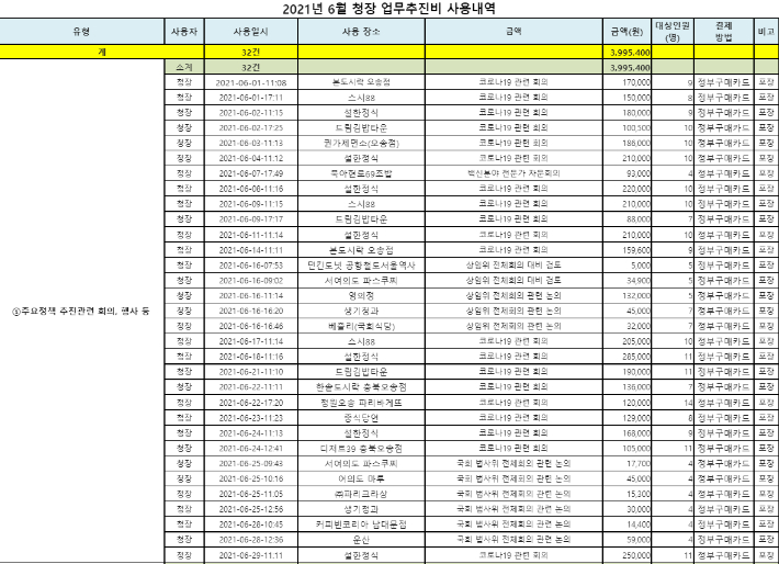 '6월 청장 업무추진비 사용내역'에 따르면 정 청장은 6월 업무추진비로 399만 5400원을 총 32회에 걸쳐 사용했다. 정 청장의 업무추진비는 대부분 질병관리청이 있는 충북 청주시 오송역 인근 분식집, 도시락집, 빵집 등에서 회의 비용으로 사용됐는데 32건 중 20건이 코로나19 관련 회의였다.