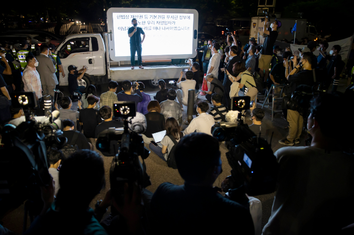 지난 14일 밤 서울 여의도공원 인근에서 열린 ''전국자영업자비대위, 거리두기4단계 조치 불복 기자회견''에서 김기홍 자영업자비대위 대표가 발언하고 있다. 연합뉴스