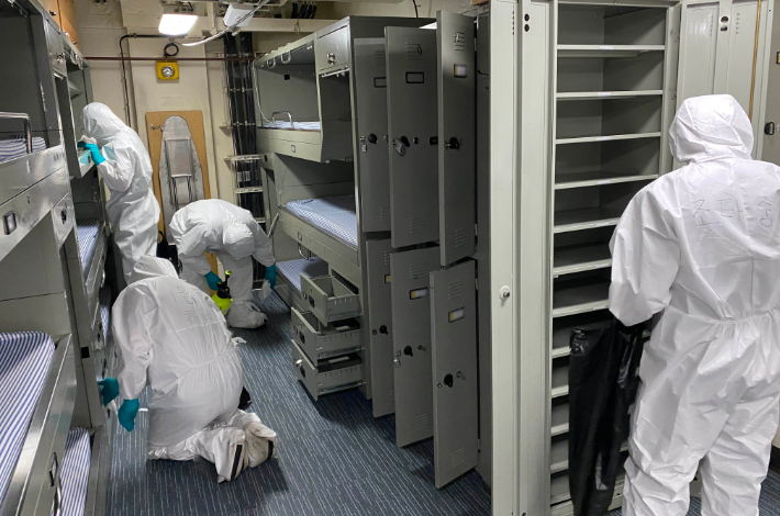 ◆ 박재민> 지금 육상부대 모든 부대들도 생활관 내에서 마스크를 낀다든지 하는 수칙이 있습니다. 그렇기 때문에 함정도 마찬가지 방역수칙이 지켜지고 있었다고 파악을 하고 있습니다.