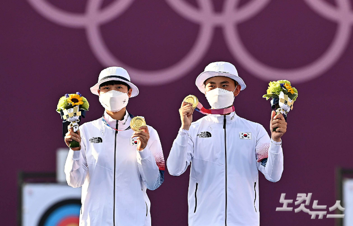 안산(20, 광주여대)과 김제덕(17, 경북일고)은 24일 유메노시마 공원 양궁장에서 열린 도쿄 올림픽 양궁 혼성전 결승에서 네덜란드를 세트 스코어 5대3으로 격파하고 금메달을 목에 걸었다.