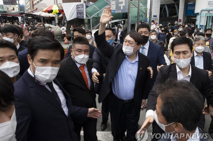 [윤석열 전 검찰총장: "초기에 코로나가 확산된 것이 대구가 아닌 다른 지역이었다라는 건 아마 민란부터 일어났을 거다라고 하는 이야기를 할 정도로 정말 이 지역분들이 자부심을 가지고 애를 많이 써줬고."]