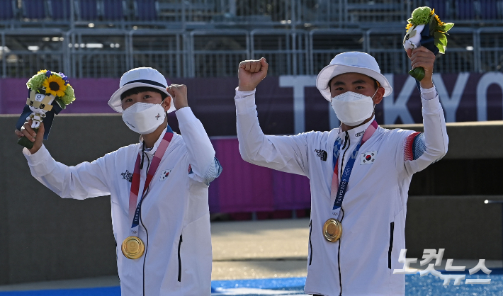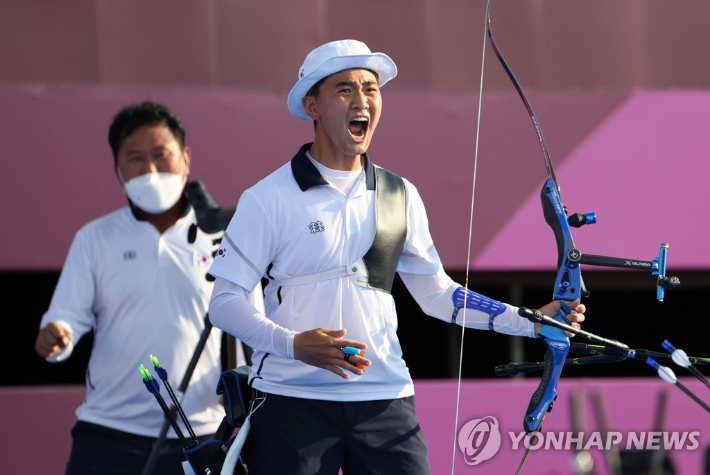 양궁 금메달 김제덕 황효진 경북일고 코치 결승전 빠이팅 외친 이유 스스로 긴장 달래는 것 혼성전 대표 선발 예상 못해 어깨 통증 상태 완벽주의 성향 하루에 1000발 꿈 그랜드슬램 롱런했으면