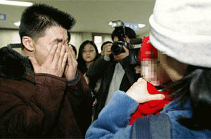 | ▶ 24일 서울 강남경찰서에서 8개월 만에 납치됐던 아들을 되찾은 J씨가 눈물을 흘리고 있다.[김태성 기자] |
