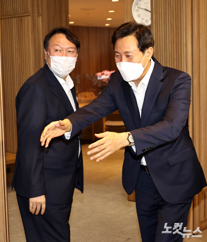 윤석열 전 검찰총장이 26일 오후 서울시청을 방문해 오세훈 서울시장을 만나고 있다. 국회사진취재단