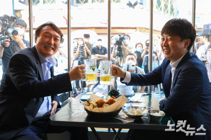 국민의힘 이준석 대표와 윤석열 전 검찰총장이 25일 오후 서울 광진구의 한 음식점에서'치맥회동'을 하고 있다. 윤석열 캠프 제공