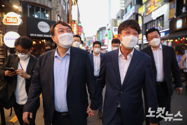 국민의힘 이준석 대표와 윤석열 전 검찰총장이 25일 오후 서울 광진구의 한 음식점에서'치맥회동' 후 손을 잡고 이동하고 있다. 윤석열 캠프 제공