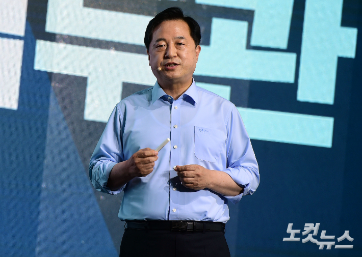 더불어민주당 대선 예비경선을 통과한 김두관 국회의원이 15일 경남도의회 브리핑룸에서 기자회견을 하고 있다. 김 의원은 이날 '홈그라운드'인 경남에서 대권 도전을 신고했다. 연합뉴스