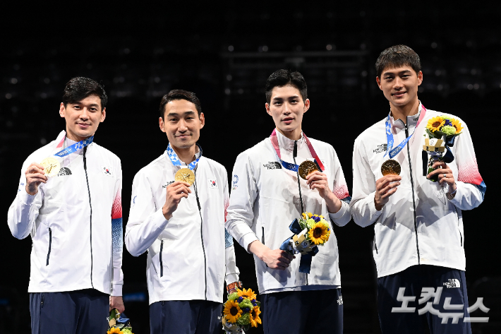구본길, 김정환, 김준호, 오상욱 선수 2020도쿄올림픽 펜싱 남자 사브르 단체전 시상식에서 금메달을 들어보이고 있다. 올림픽사진공동취재단