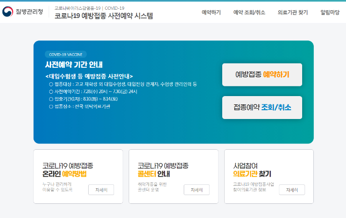 코로나19 예방접종 사전예약 시스템 홈페이지 캡처