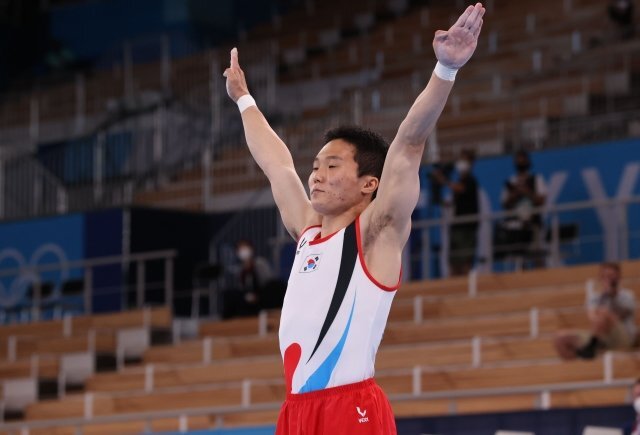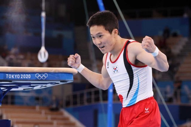 2일 일본 아리아케 체조경기장에서 열린 2020 도쿄올림픽 기계체조 남자 도마 결승에서 신재환이 연기를 마치고 환호를 하고 있다. 도쿄= 올림픽사진공동취재단