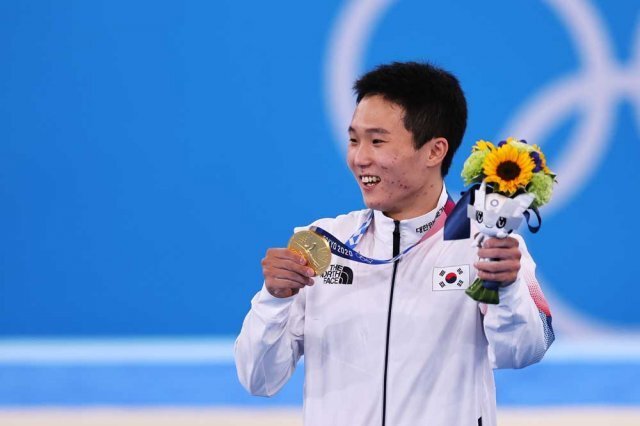 신재환은 2일 일본 도쿄 아리아케 체조 경기장에서 열린 2020 도쿄 올림픽 남자 기계체조 도마 결승전에서 금메달을 목에 걸었다.