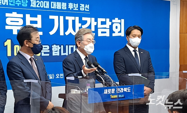 지난 1일 전북도의회 브리핑룸에서 열린 이재명 더불어민주당 대선 경선 후보 기자간담회 모습. 김용완 기자