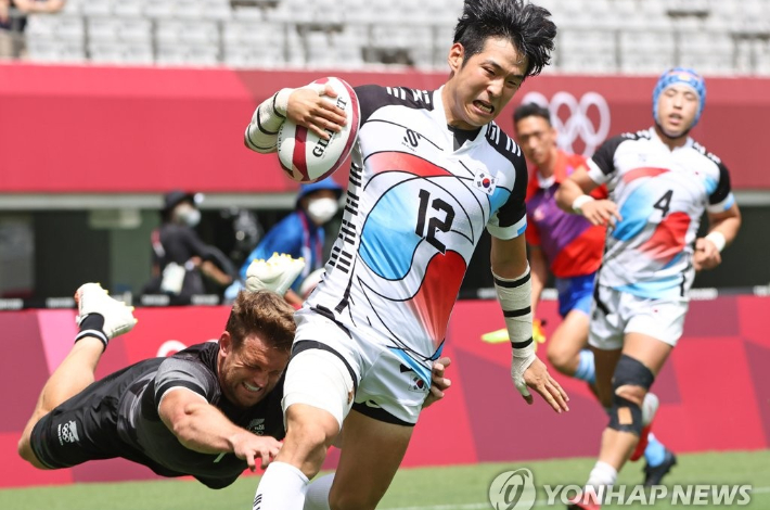 럭비 대표팀 정연식이 26일 일본 도쿄스타디움에서 열린 도쿄올림픽 7인제 럭비 조별리그 A조 뉴질랜드와 첫 경기에서 트라이로 득점을 기록하고 있다.