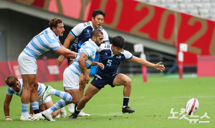 27일 일본 도쿄 스타디움에서 열린 2020 도쿄 올림픽 남자 7인제 럭비 A조 예선 대한민국과 아르헨티나의 경기에서 한국 대표팀 이성배 선수가 공을 쫒아가고 있다. 이한형 기자