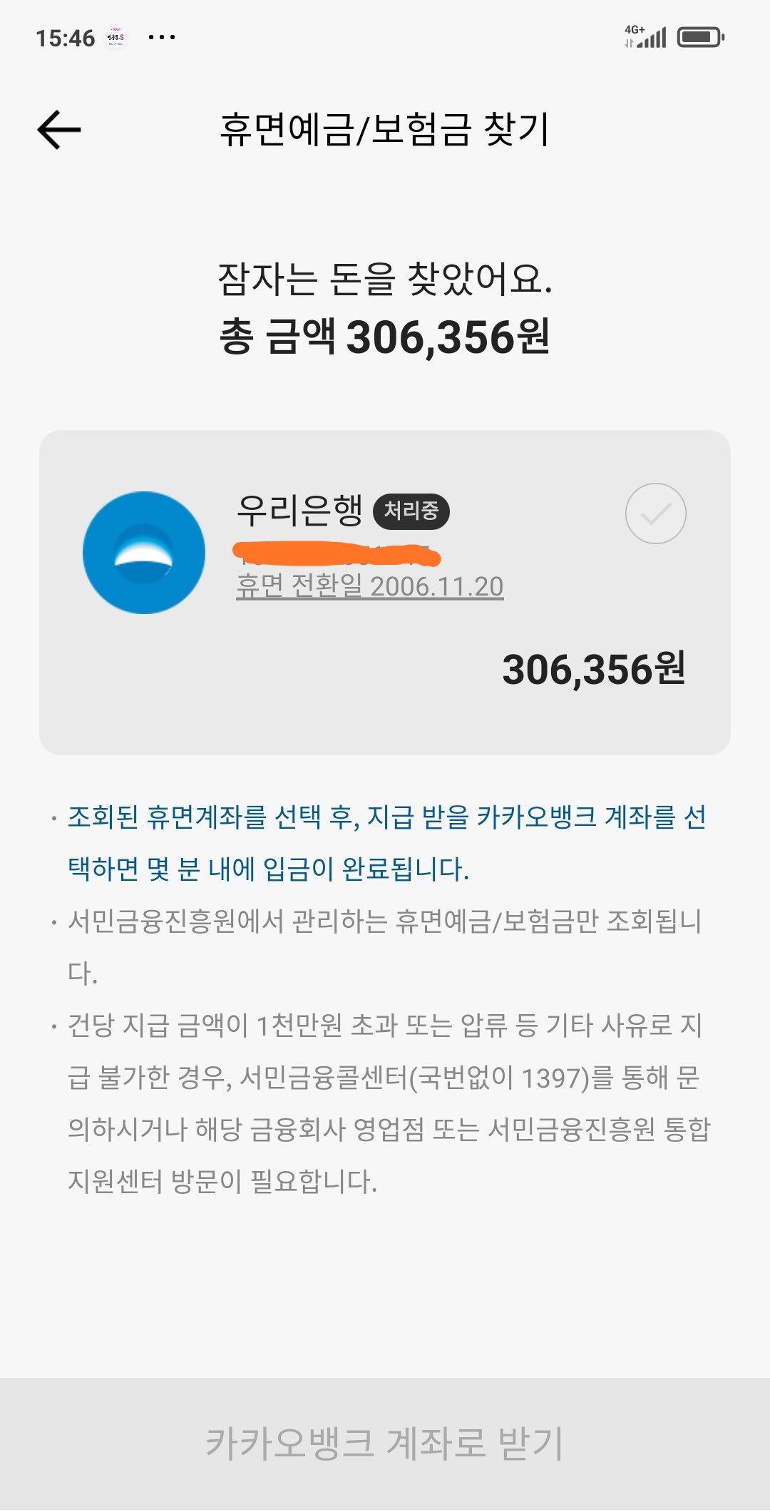 휴면 전환일이 무려 2006년11월20일... 그 옛날에 통장에 있었던 돈이 휴면계좌로 "서민금융진흥원"에서 관리하고 있었다니... 깜짝 놀랄 일이다.