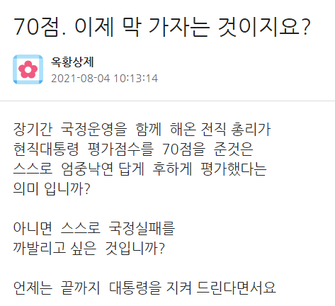 민주당 권리당원 게시판에도 이 전 대표의 ‘70점’ 평가를 놓고 부정적인 반응이 나왔다. 한 당원은 “노무현 대통령 현직때 그렇게 괴롭히더니 문재인 대통령한테도 칼 꼽네”라며 “총리 때 대통령 시키는 대로만 했음 아무 탈 없었을 것”이라고 했다.