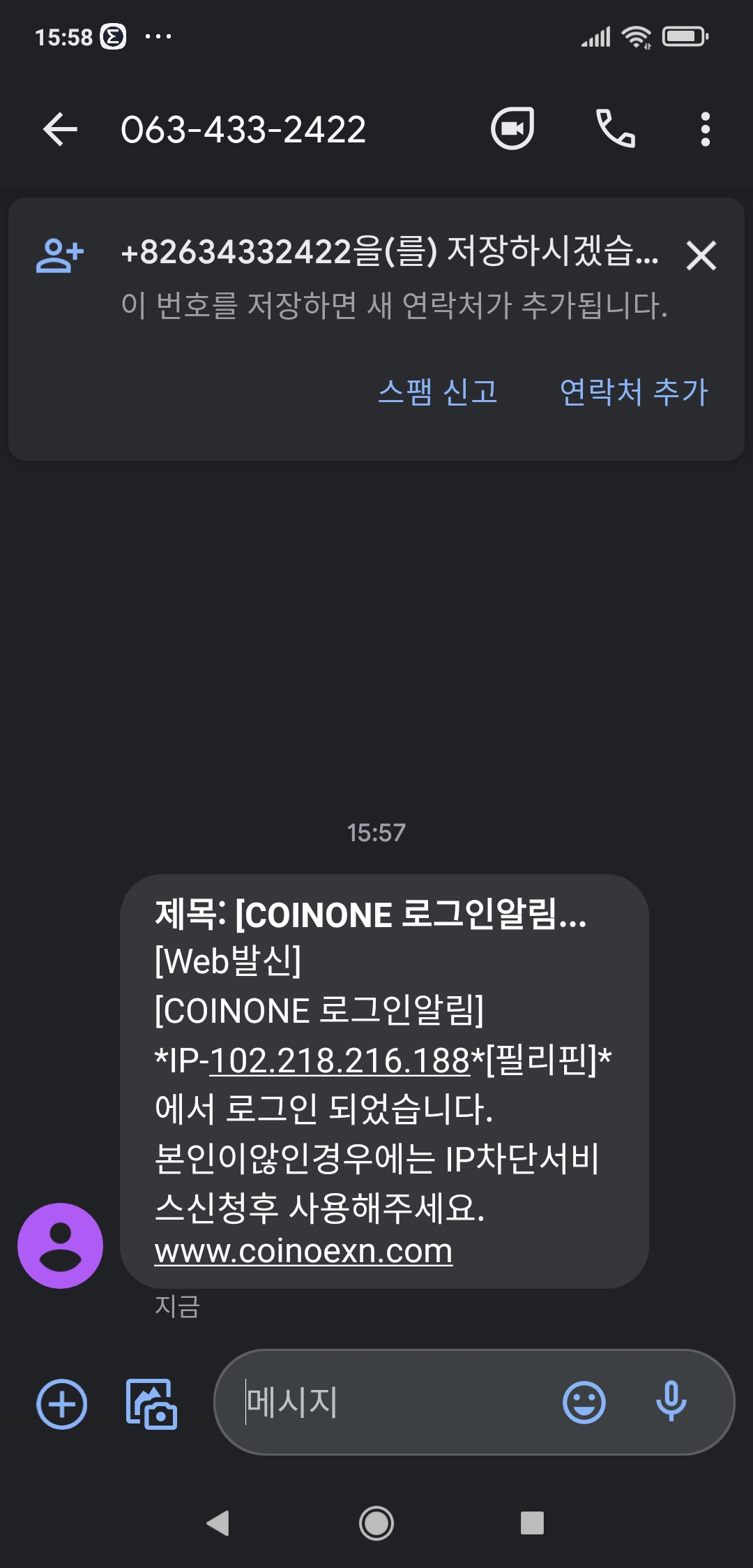 > SMS로 코인원을 사칭하여 피싱사이트로 유도하는 경우가 발생하고 있습니다.