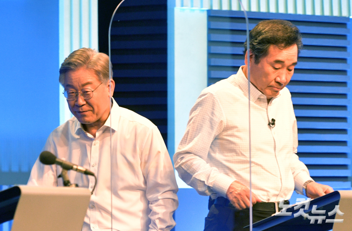 이재명 더불어민주당 대선 경선 후보가 4일 서울 마포구 YTN미디어센터에서 열린 YTN 주최 TV토론에서 이낙연 후보를 지나치고 있다. 국회사진취재단