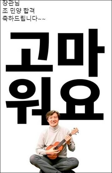 조씨의 의사 국가시험 합격 소식은 지난 15일 알려졌다. 이날 조 전 장관의 소셜미디어(SNS) 페이스북 한 게시글에 ‘장관님 조민양 합격 축하드립니다’라는 댓글과 함께 조 전 장관이 ‘고마워요’라는 글자를 배경으로 우쿨렐레를 들고 앉아 있는 사진이 올라온 것이다. 해당 사진은 조씨의 합격 소식을 들은 지지자들이 조 전 장관을 위해 만든 것으로 알려졌다.