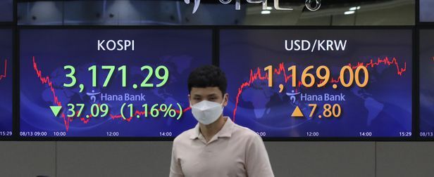 2021년 8월 13일 서울 중구 하나은행 딜링룸에서 딜러들이 업무를 보고 있다. 이날 코스피 지수는 전날보다 37.09p(1.16%) 내린 3,171.29 에 거래를 마쳤다. 서울 외환시장에서 원/달러 환율은 전장보다 7.8원 오른 1,169.0원으로, 코스닥은 13.31p(1.26%) 내린 1,040.78 로 마감했다./김연정 객원기자