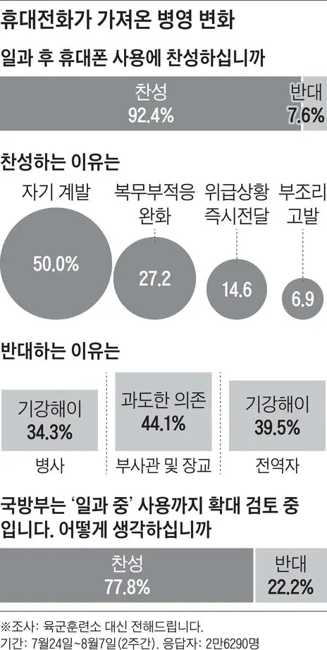 소수이지만, 일과 후 휴대전화 사용에 반대하는 의견도 있었다. 휴대전화를 사용하는 병사 중에서는 6.1%가 반대했는데, ‘카톡을 이용한 선임병들의 사적 지시가 우려된다’ ‘SNS에 셀카(사진)를 올리는 등 원칙에 어긋난 행동을 하는 이들이 있다’ 등이 그 이유였다. 육군 3포병여단에서 복무했던 신모(22)씨는 “훈련이 힘든 건 변함 없는데, 휴대전화가 있다는 이유로 소위 ‘꿀 빤다’는 말을 듣기 싫었다”며 “조롱을 들을 바에 차라리 없는 게 낫다”고 했다.