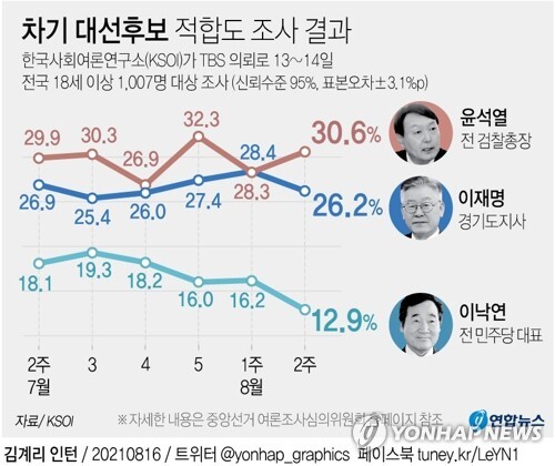 윤석열 전 검찰총장이 30%대 지지율을 회복한 여론조사 결과가 16일 나왔다.한국사회여론연구소(KSOI)가 <교통방송>(TBS) 의뢰로 지난 13~14일 전국 유권자 1007명을 대상으로 시행한 차기 대선후보 적합도 조사(신뢰수준 95%, 표본오차 ±3.1%포인트)에서 윤 전 총장은 지난주보다 2.3% 상승한 30.6%를 기록했다. 이 지사는 2.2%포인트 하락한 26.2%였다. 지난주 조사에서 윤 전 총장과 이 지사 적합도는 각각 28.4%-28.3%로 박빙을 기록한 바 있다.