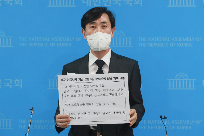 국민의힘 대선 예비후보 하태경 의원이 13일 국회 소통관에서 해군 성추행 피해 여중사 사망 사건에 관한 기자회견을 열고 있다. 윤창원 기자