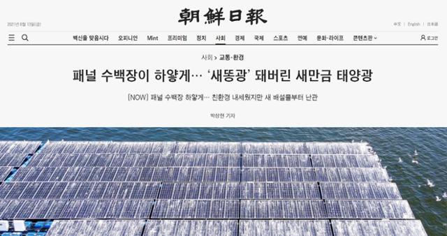8일 '조선일보'가 새만금호 수상태양광(수상광) 시험시설의 조류 분비물 문제를 보도하면서 일부 온라인 커뮤니티를에서 수상광에 대한 비관론이 제기됐다. 조선일보 온라인 기사 캡처