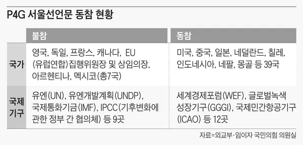 또 유엔과 유엔개발계획(UNDP), 유엔기후변화협약(UNFCCC), 생물다양성협약(CBD) 등 국제 기구 9곳도 “동참 의사를 표명할 수 없다”고 했다. 이에 서울선언문은 미국과 중국, 일본, 인도네시아, 네팔 등 39국과 P4G 회원 단체인 글로벌녹색성장연구소(GGGI) 등 국제 기구 12개가 동참하는 데 그쳤다. 주요국 정상과 국제 기구 수장들이 행사에 참가하고도 선언문 동참에 거부한 이례적인 일이 벌어진 것이다. 이에 대해 외교부는 “상당수 국제 기구는 ‘서울선언문 취지에는 공감하지만 내부 규정상 명시적으로 참가하지 못했다’며 양해를 구한 경우가 있었다”고 밝혔다.