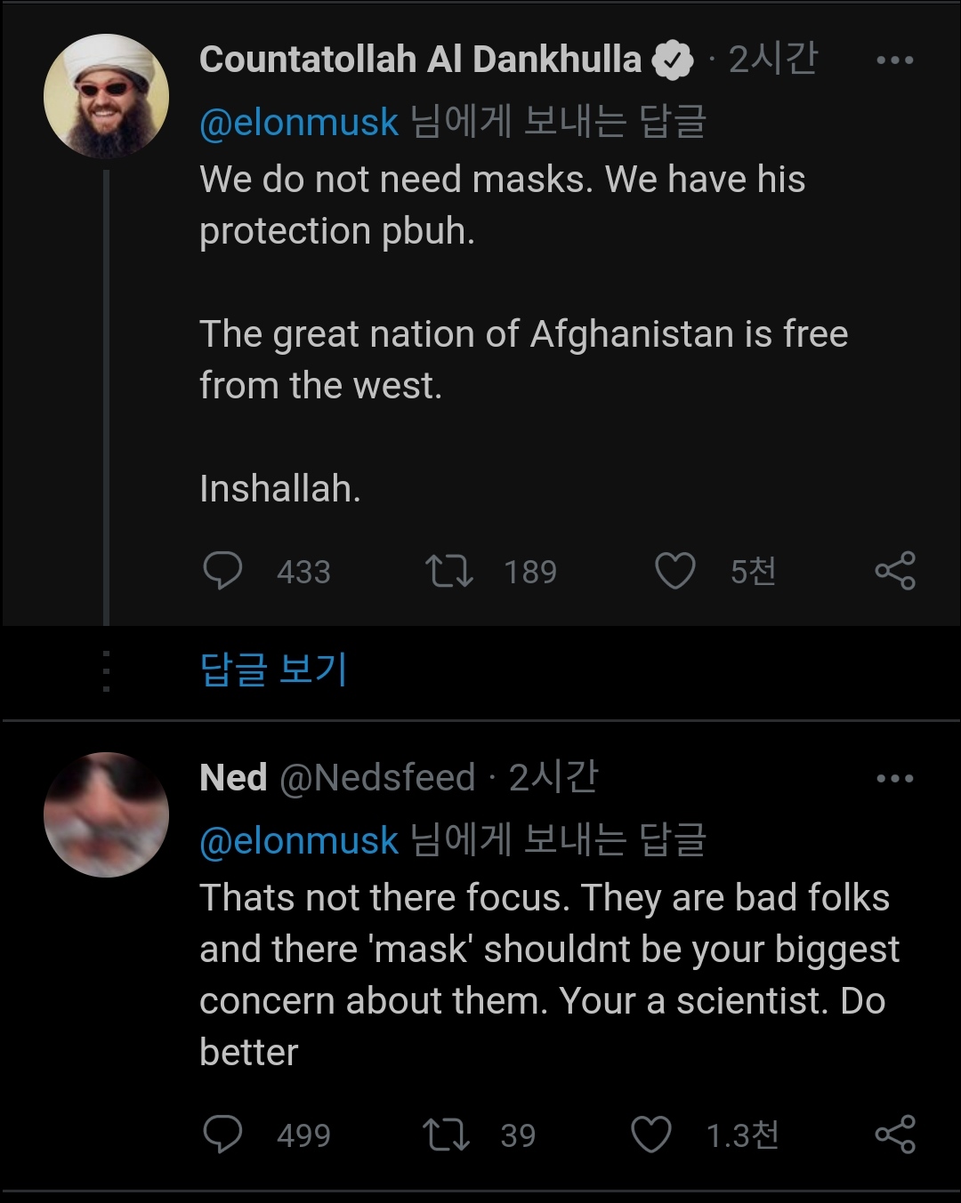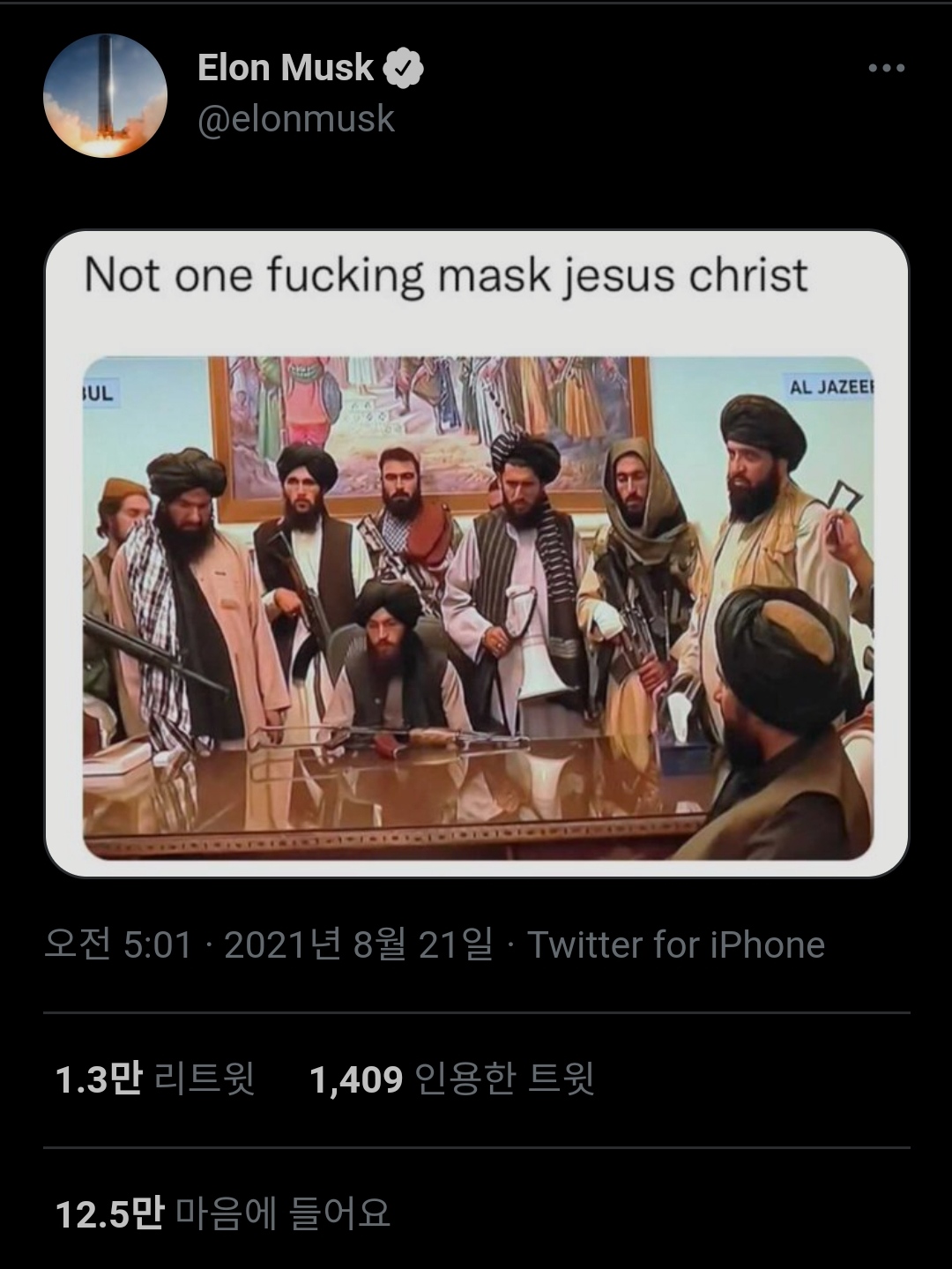 Elon Musk 텔레반을 향해 트윗 날려 Not one fucking mask jesus christ 리트윗 2시간만에 1.3M 일론 머스크 휴머노이드 로봇 테슬라봇 홍보할 시간 아닌가?