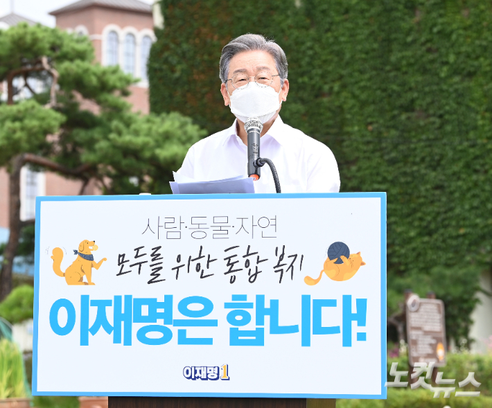 더불어민주당 대선 예비후보 이재명 경기도지사가 지난 20일 경기도 고양시 덕양구 농업기술센터 내 잔디밭에서 첫 동물복지 공약을 발표하는 모습. 국회사진취재단