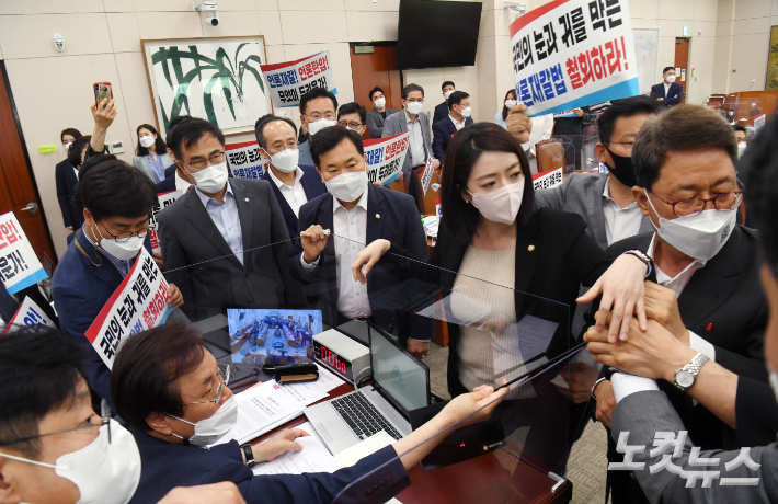 19일 오후 서울 여의도 국회 문화체육관광위원회 전체회의에서 국민의힘 의원들이 언론중재법 개정안 통과시키려는 도종환 위원장의 회의 진행를 막아서고 있다. 윤창원 기자