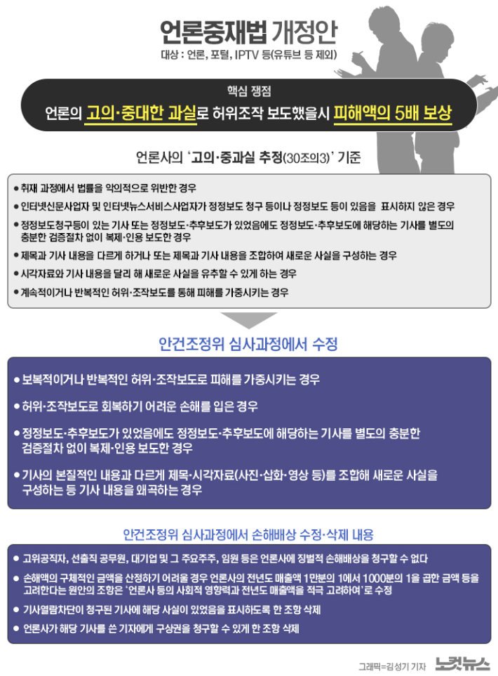 징벌적 손해배상을 청구할 수 있는 내용 등을 담은 법안이다. 야당과 언론단체들은 비판적 보도에 재갈을 물릴 수 있다고 우려하고 있다.