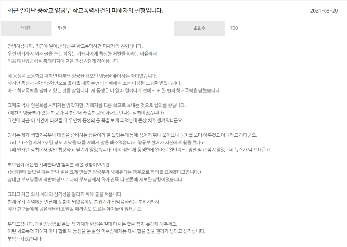 중학교 양궁부 선배가 후배를 활로 쏜 사건, 학교폭력 더 이상 두고 볼 수 없습니다. > 대한민국