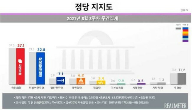 이날 리얼미터가 <와이티엔>(YTN) 의뢰로 지난 17~20일 전국 성인 2013명을 대상으로 조사한 결과(신뢰 수준 95%, 오차범위 ±2.2%포인트), 문재인 대통령의 국정 수행 긍정 평가는 지난주보다 0.4% 하락했다. 부정평가는 1.1% 상승한 55.7%였다. 국정수행에 대한 긍‧부정 평가 차이는 14.1%로 지난 격차(12.6%)보다 더 벌어졌다. 정당지지도는 국민의힘이 37.1%, 더불어민주당 32.8%, 열린민주당 7.1%, 국민의당 6.2%, 정의당 3.4% 차례였다. 국민의힘과 더불어민주당은 지난 조사보다 각각 0.2%포인트와 0.7%포인트 하락했다. 국민의힘은 중도층 지지가 43.4%에서 39.8%로 하락했고, 더불어민주당은 진보층 지지가 58.6%에서 54.9%로 하락했다. 이번 지지도 조사 문항은 “다음 중 어느 정당을 지지하거나 약간이라도 더 호감을 갖고 계시나”였고, 무선전화(90%)와 유선전화(10%)를 병행 무작위생성 표집틀을 이용한 임의 전화걸기 방법으로 진행됐다. 자세한 내용은 중앙선거여론조사심의위원회나 한국사회여론연구소‧리얼미터 누리집을 참조하면 된다.