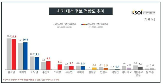 [KSOI] 윤석열 29.8% 이재명 26.8%…차기대선주자 적합도 오차범위 내 접전 이낙연 12.4%, 홍준표 8.4%, 최재형 5.1% 유승민 3.6% 추미애 3.3% 심상정 2.1% 안철수 1.5%