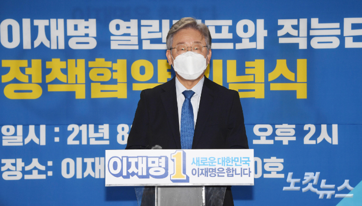 더불어민주당 대선 예비후보인 이재명 경기지사가 24일 서울 여의도 선거캠프에서 열린 직능단체와의 정책협약 기념식에 참석해 인사말을 하고 있다. 윤창원 기자