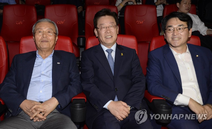 더불어민주당 김종인 비상대책위 대표가 2016년 8월 15일 오후 서울 영등포구 타임스퀘어 CGV에서 이재명 성남시장, 박용진 대표비서실장 등과 '덕혜옹주'를 관람하고 있다. 연합뉴스
