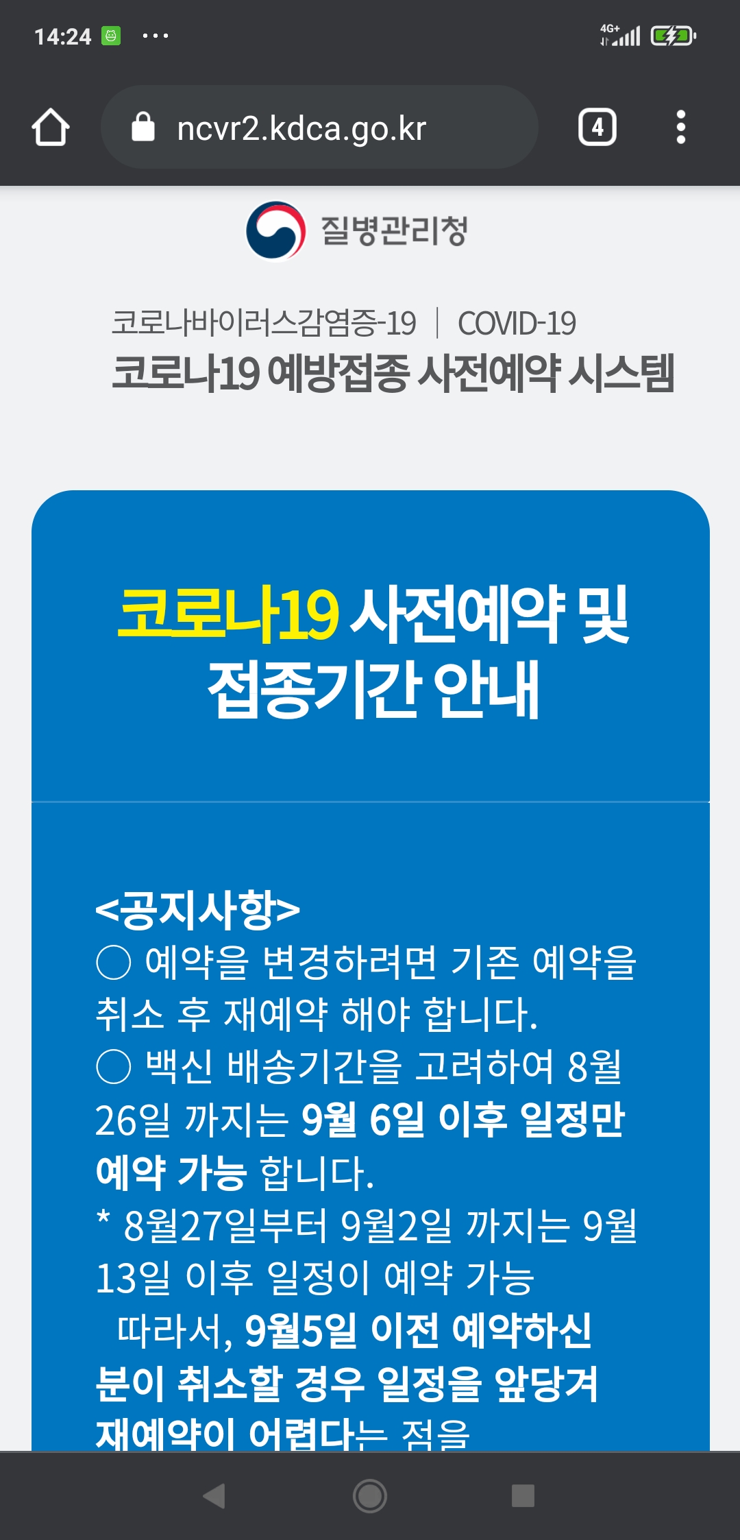 현재 9월 6일(월)~19일(일)까지 예약 가능한 인원이 확대되었습니다. 접종 일정을 9월 6일(월)~12일(일)로 앞당겨 예약하고자 하시는 분들은 8월 26일(목) 24시까지, 9월 13일(월)~19(일)로는 9월 2일(목) 24시까지 사전예약시스템(https://ncvr.kdca.go.kr)에서 예약을 변경하실 수 있습니다(예약 취소 후 재예약).