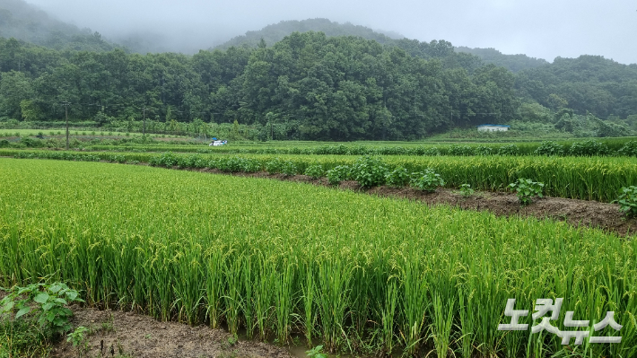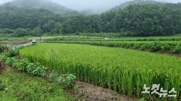 세종시 전의면 신방리 493 일대 윤 의원 일가 토지에 잘 관리된 벼가 빼곡히 심어져 있다. 김정록 기자