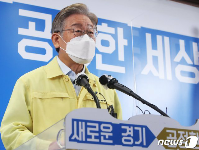 이재명 경기도지사가 13일 오전 경기도 수원시 팔달구 경기도청 브리핑룸에서 5차 재난지원금 전 도민 지급 관련 브리핑을 하고 있다. 이날 이재명 지사는 5차 재난지원금을 전 도민에게 지급하기로 밝혔다. 2021.8.13/뉴스1 © News1