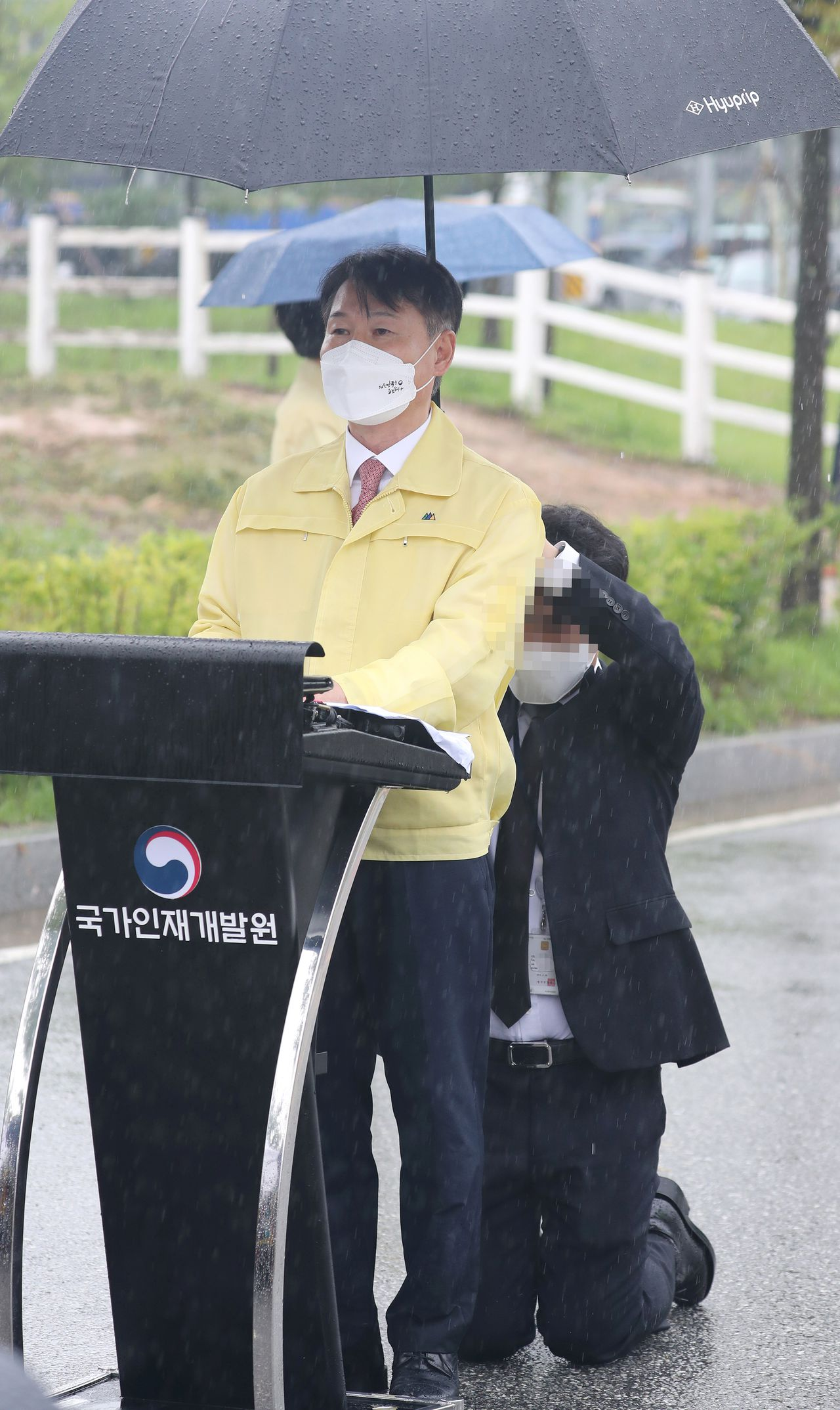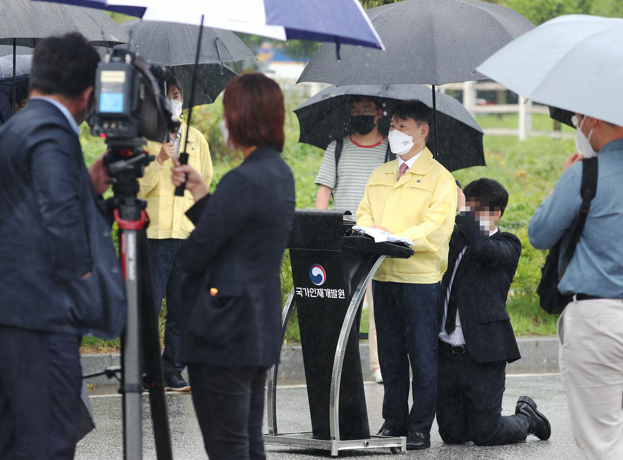 이날 진천에는 시간당 10mm 안팎의 꽤 많은 비가 내렸다. 강 차관의 발언은 브리핑에서만 10분 이상 걸렸는데, 이 시간 내내 법무부 한 직원은 강 차관 뒤에서 아스팔트 바닥에 무릎을 꿇고 양손으로 우산을 받쳐 올려 강 차관이 비를 맞지 않도록 했다.