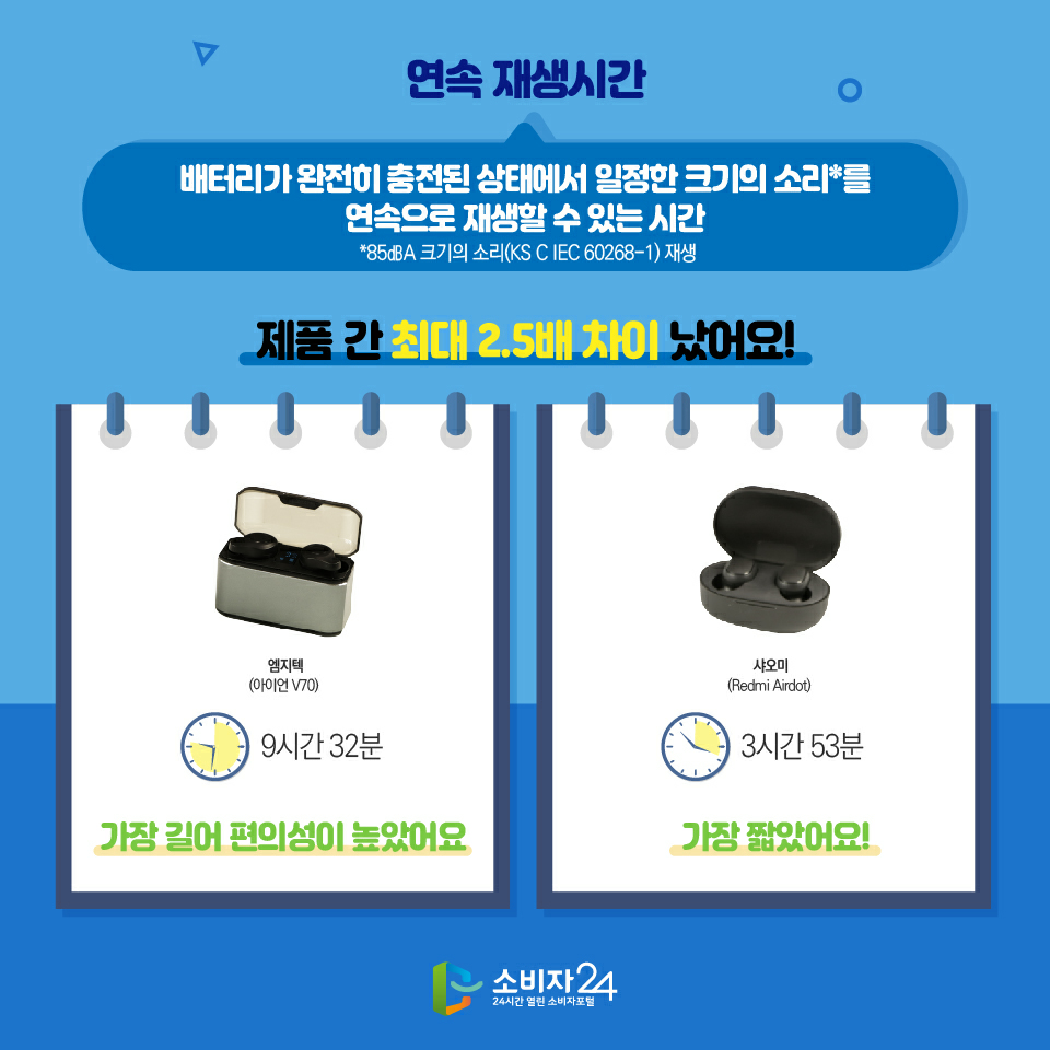 배터리가 완전히 충전된 상태에서 일정한 소리를 연속 재생할 수 있는 시간을 확인한 결과, 제품별로 최대 2.5배(3시간 53분~ 9시간 32분) 차이가 있었습니다. 엠지텍(아이언 V70) 제품이 9시간 32분으로 가장 길어 편의성이 높았고, 샤오미(Redmi Airdot) 제품은 3시간 53분으로 가장 짧았습니다.