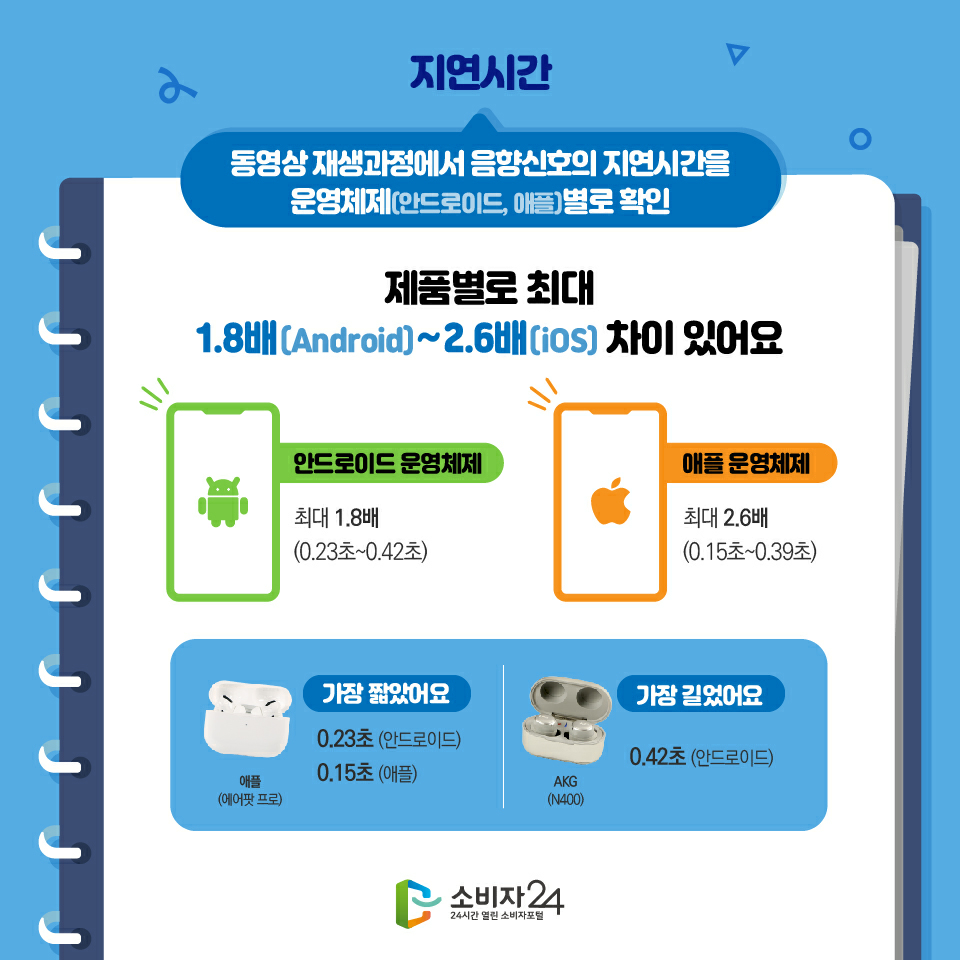 동영상 재생과정에서 음향신호의 지연시간을 확인한 결과, 애플(에어팟 프로) 제품이 0.23초~0.15초로 가장 짧았고, AKG(N400) 제품이 0.42초로 가장 길었습니다.