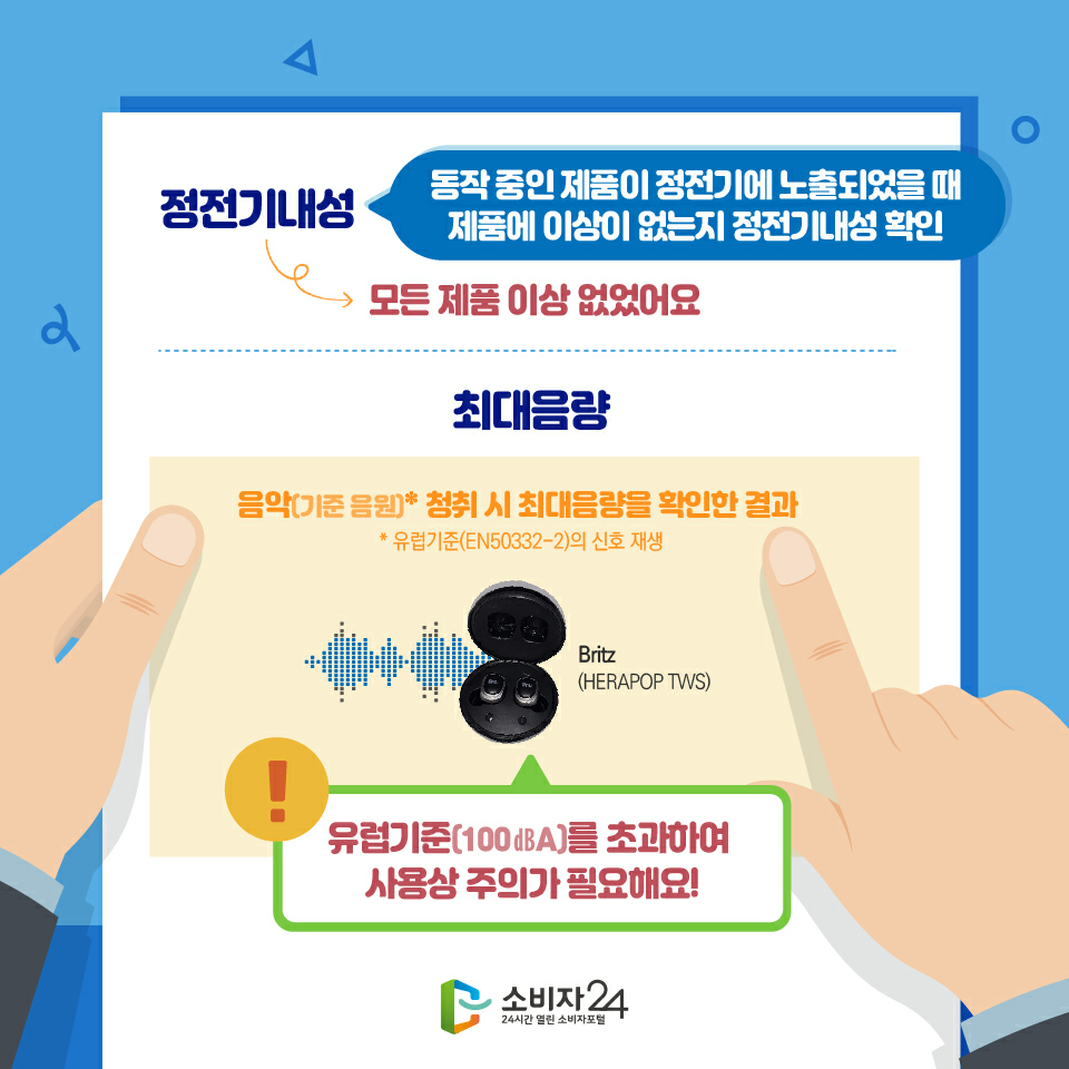 동작 중인 제품이 정전기에 노출됐을 때 제품에 이상이 없는지 정전기내성을 확인한 결과, 모든 제품에 이상이 없었습니다. 다만, 음악 청취 시 최대음량을 확인한 결과에서는 Britz(HERAPOP TWS) 제품이 유럽기준(100㏈A)를 초과해 사용상 주의가 필요한 것으로 나타났습니다.