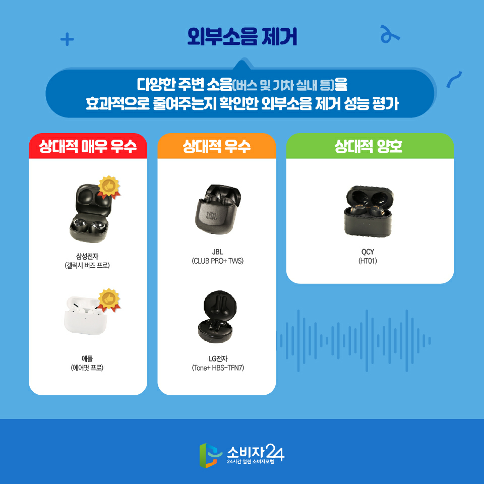 한편 음향품질과 통화품질, 외부소음 제거 기능에서는 제품 간 차이는 있었지만 대부분 보통 수준 이상의 성능을 보였습니다.