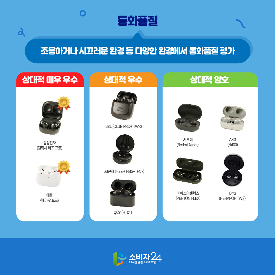 한국소비자원은 소비자 선호도가 높은 블루투스 이어폰 10개 제품을 대상으로 음향품질, 통화품질 등을 시험 평가 했다고 한다.
