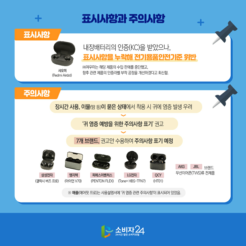 귓속에 밀착되는 커널형 이어폰은 장시간 사용하거나 땀 등이 묻은 상태에서 착용 시 귀에 염증이 발생할 수 있어 ‘귀 염증 예방을 위한 주의사항 표기’를 권고했고, 삼성전자와 엠지텍 등 7개 브랜드가 권고안을 수용해 주의사항을 표기할 예정입니다.