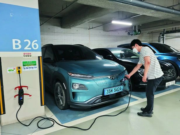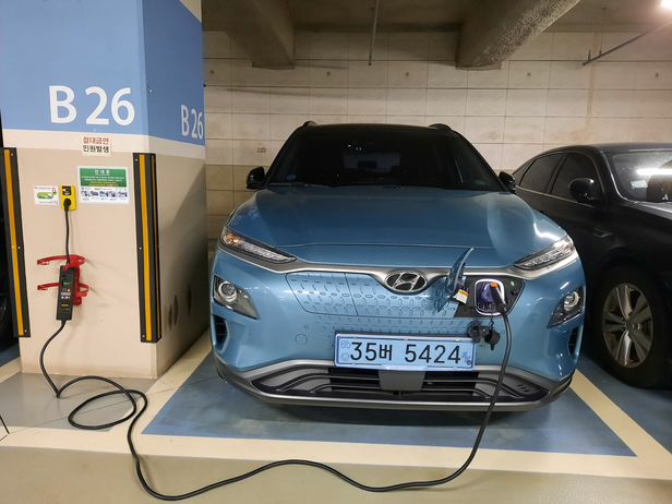 한 아파트 지하주차장에 설치된 콘센트형 충전기로 현대차 코나EV 전기차를 충전하는 모습. 기둥 벽면에 붙은 노란색 장치가 콘센트형 충전기로, 주유기처럼 충전량을 정해 스마트폰 앱으로 결제를 하면 충전이 가능하다. 이 장치와 연결된 충전 케이블은 전기차 소유자가 구매해 차량에 갖고 다녀야 한다. /파워큐브