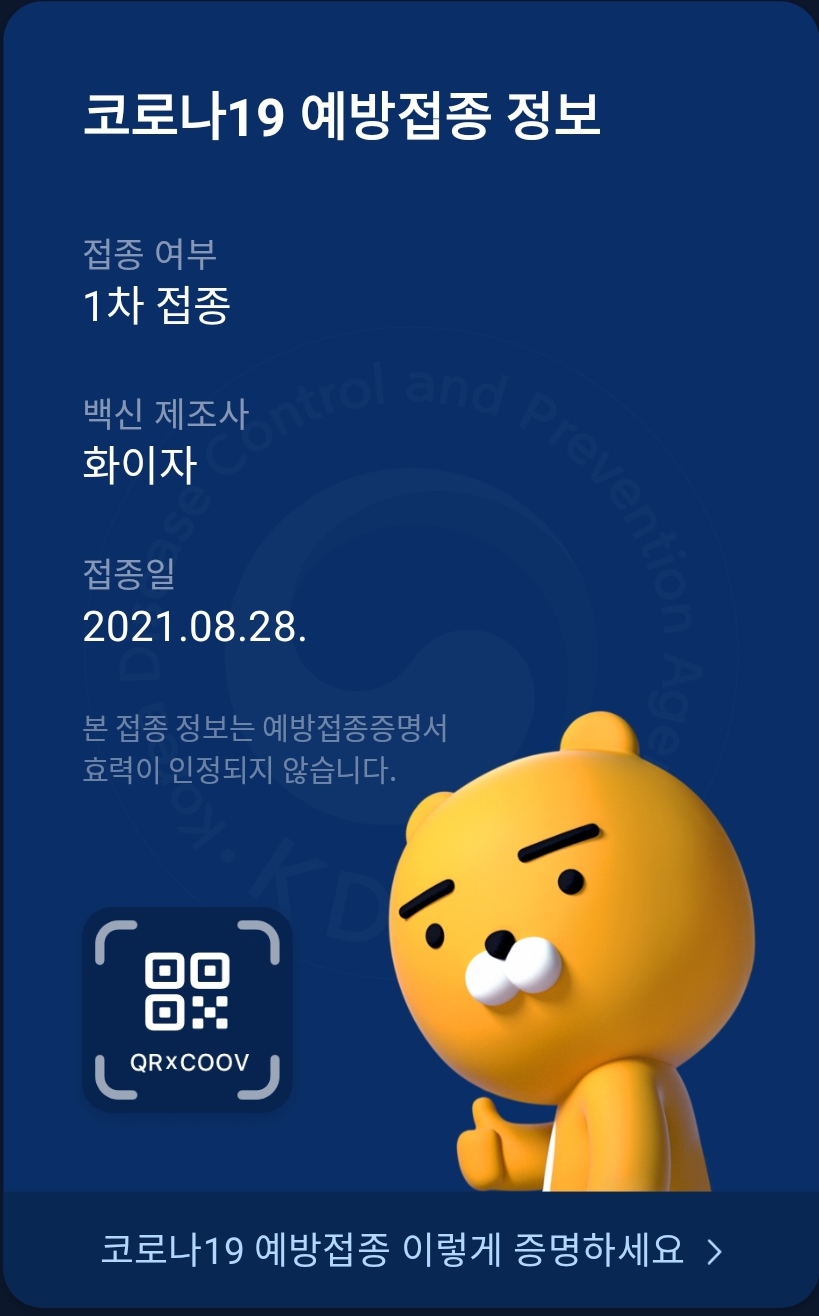 카카오톡에서 QR코드 확인해보니 미접종으로 표시되었다.
